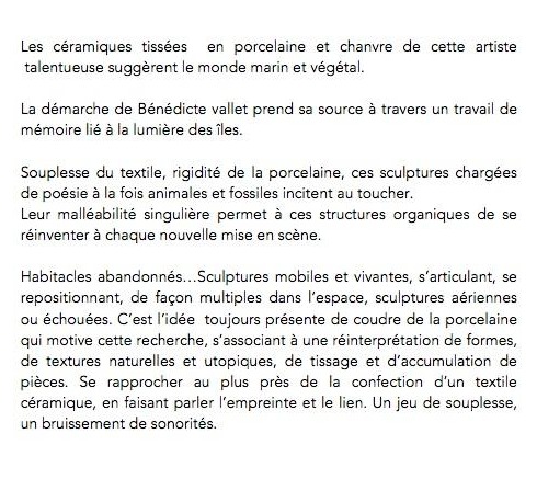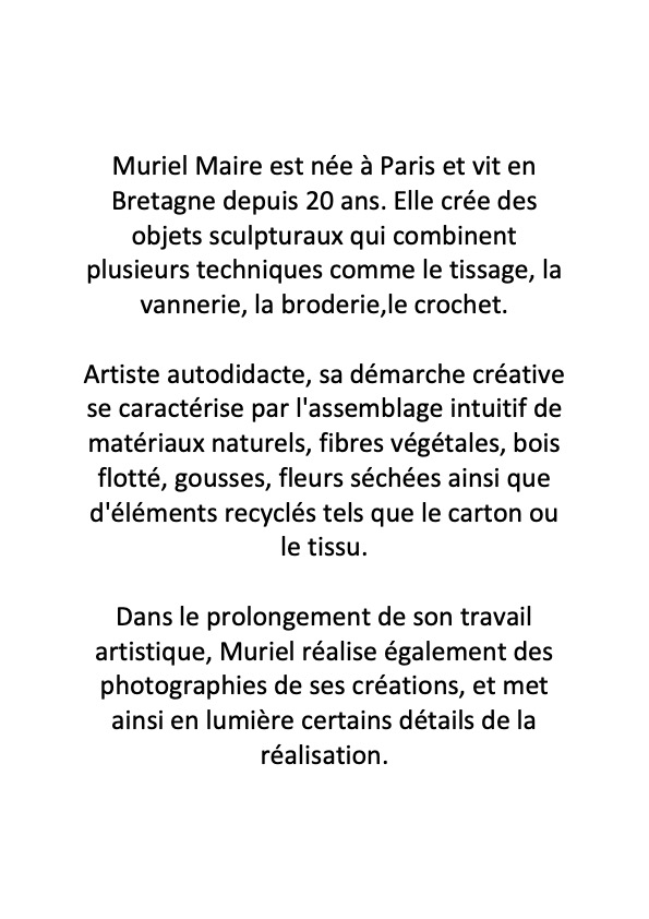 Dans mon travail "le faire" a sa nécessité comme si l'oeuvre finie devait se révéler. Petit à petit, comme la trame d'une tessiture qui prend forme, geste après geste, comme si la multiplicité était nécessaire pour dévoiler le tout. Les objets créés ont un pouvoir évocateur qui touche des rémiscences lointaines, d'autres espaces et d'autres lieux.
