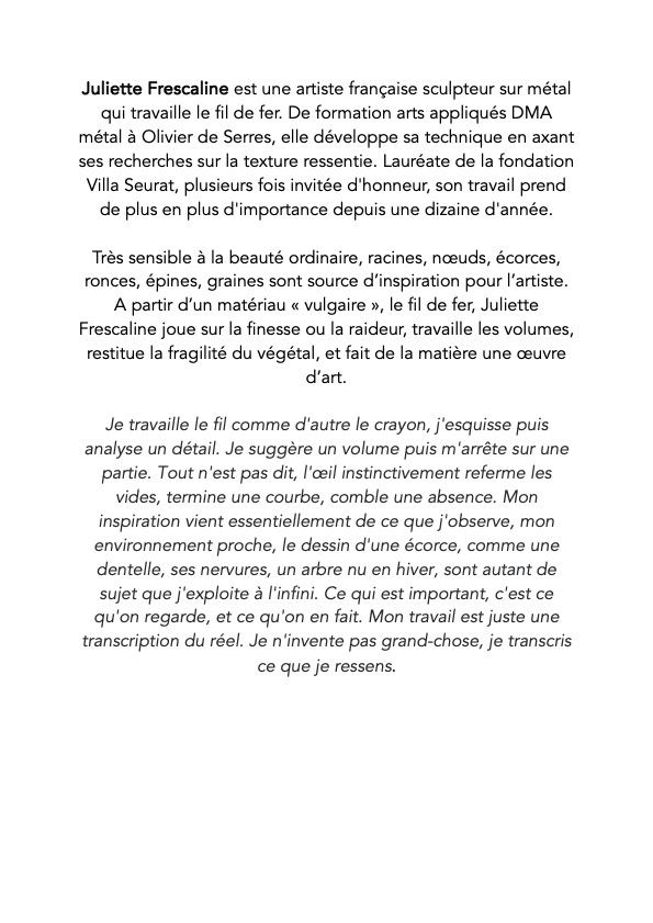 Aujourd’hui, Valentine est sculpteur calligraphe. Une calligraphe qui sculpte les mots. Ces mots qui la touchent, la construisent et la guident sont autant de dessins: elle s’approprie leur trait dans une graphie toute personnelle, et sculpte leurs courbes à main levée au fil de métal, donnant ainsi corps aux mots, et vie à l’espace.