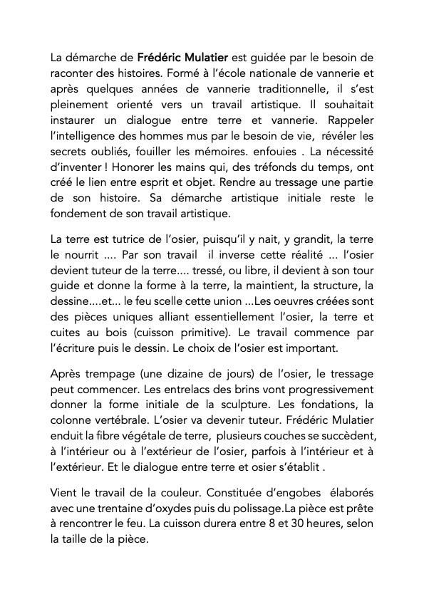 Au sortir du four, la sculpture est tout d'abord obsevée minutieusement. L'osier, fruit de la terre est devenu son tuteur. Parfois il ne reste plus que son empreinte dans la terre. parfois, protégé par l'argile il demeure intact, ou calciné.La terre, elle, a pris des teintes nuancées.
