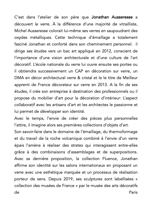 Après ses carnets de croquis sur Pointe à Pitre et Basse-Terre, il abandonne ses crayons pour dérouler ses esquisses en lame de métal. Sa rencontre avec la sculpture est un véritable coup de foudre. Le besoin d’apprendre, de se rapprocher des courants artistiques du Sud de la France et de l’Italie, l’amènent aujourd’hui à Nice.