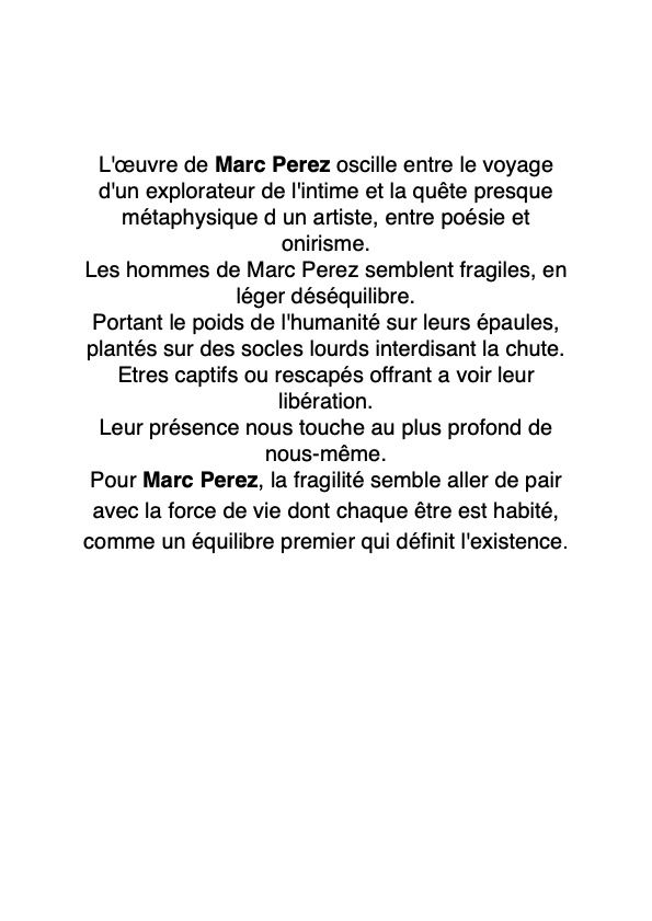 Le fait de solliciter une mémoire intemporelle commune aux hommes est pour moi fondamental. Comme il est fondamental d'essayer, avec mon travail, de casser le rythme du présent pour entrer dans une dimension espace-temps différente, ou le sacré peut s'exprimer parce qu'il s'adresse à la partie sacrée de chaque individu. La tentative est de renouer les liens entre l'homme et son essence, entre l'homme et son esprit, esprit entendu comme ame, à travers des formes essentielles, simples, archétypales.